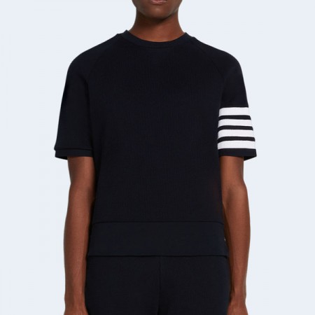• 톰브라운 네이비 컴팩트 와플 4-바 쇼트 슬리브 스웨트 티셔츠